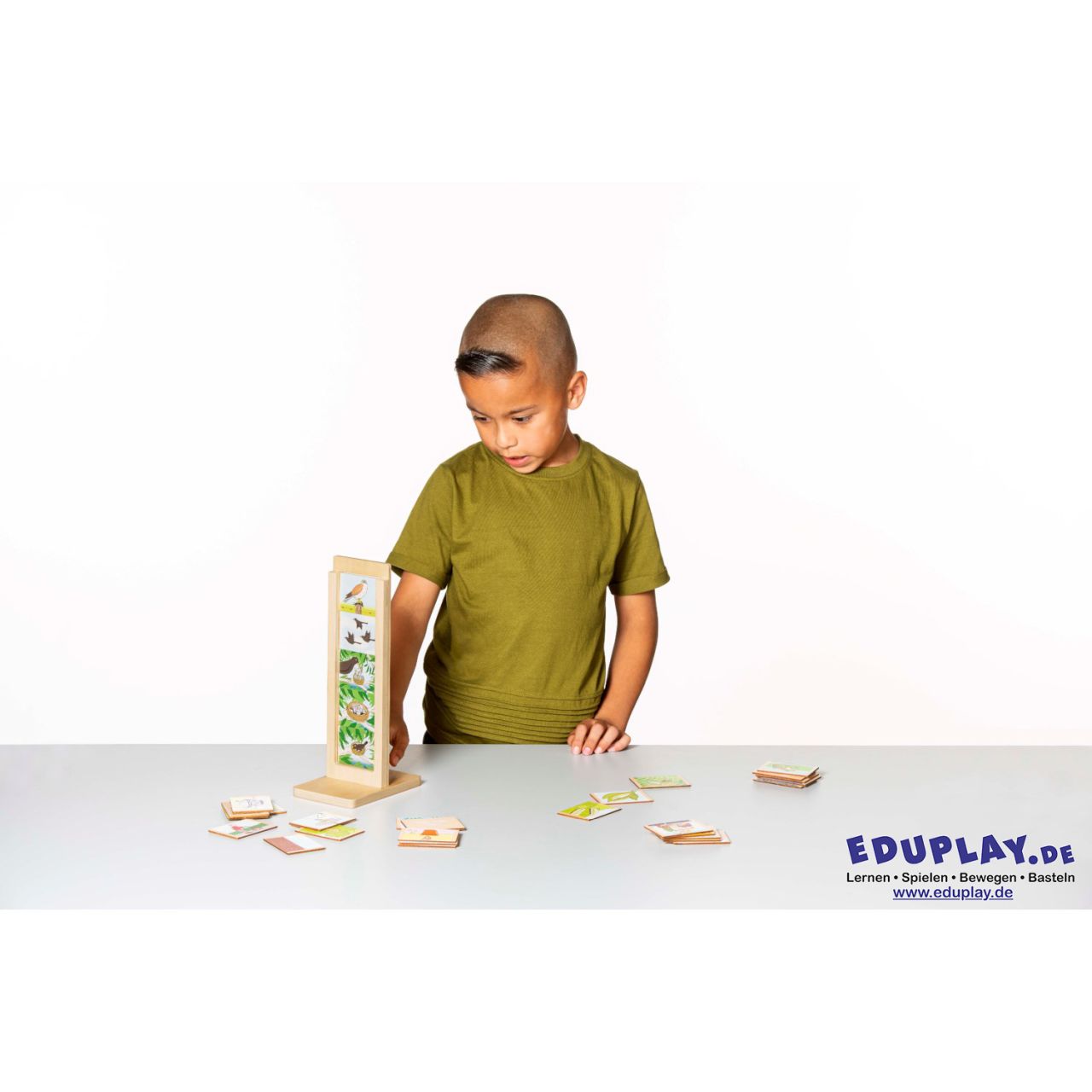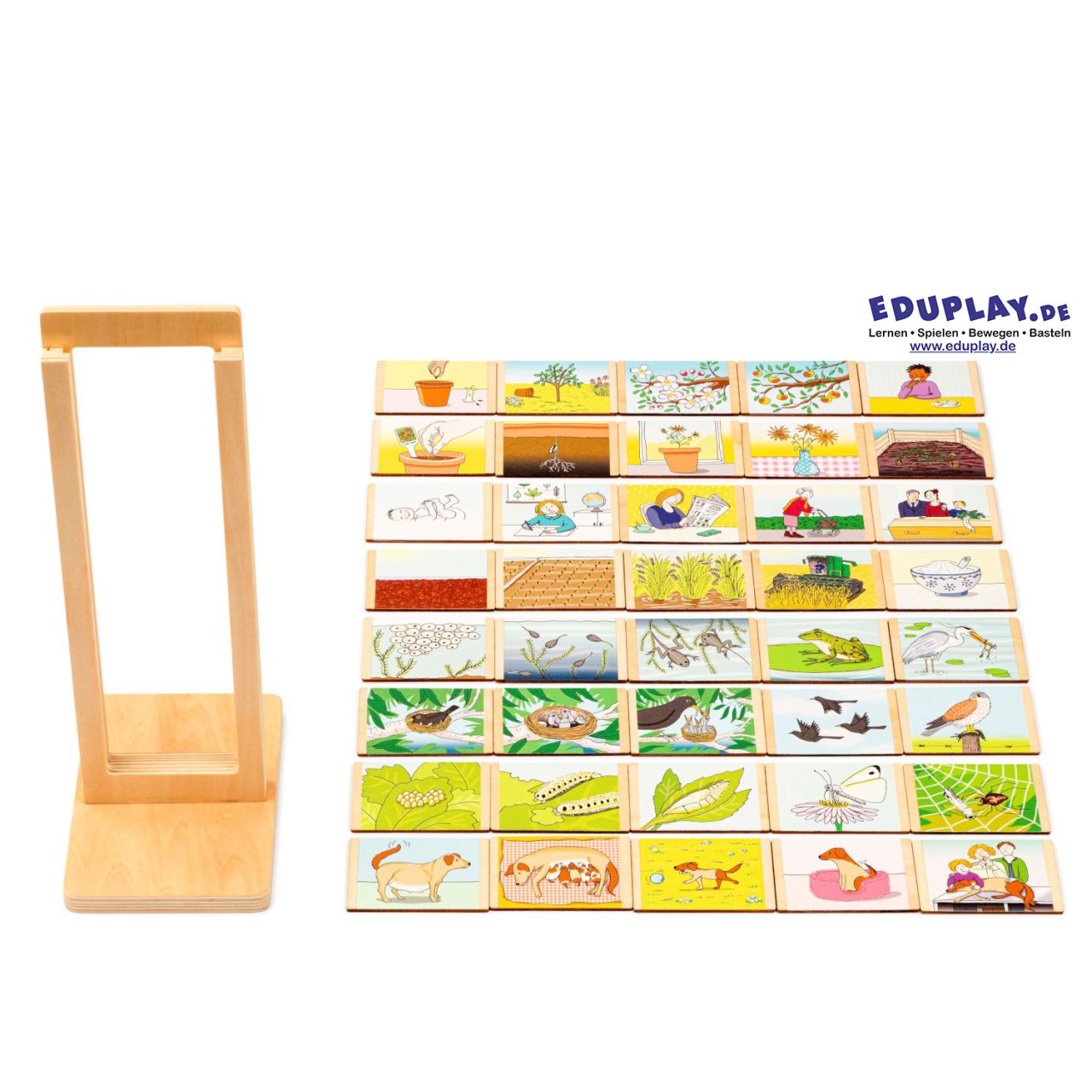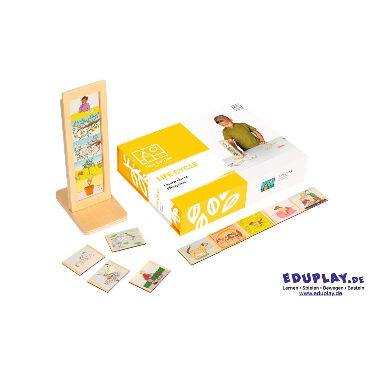Setze den Lebenszyklus in der richtigen Reihenfolge in den Holzständer. Das Set enthält den Lebenszyklus von: Mensch, Hund, Wespe, Schmetterling, Frosch, Vogel, Blume, Karotte, Apfel und Reis. Inhalt: 40 Karten, 1 Ständer, Anleitung.