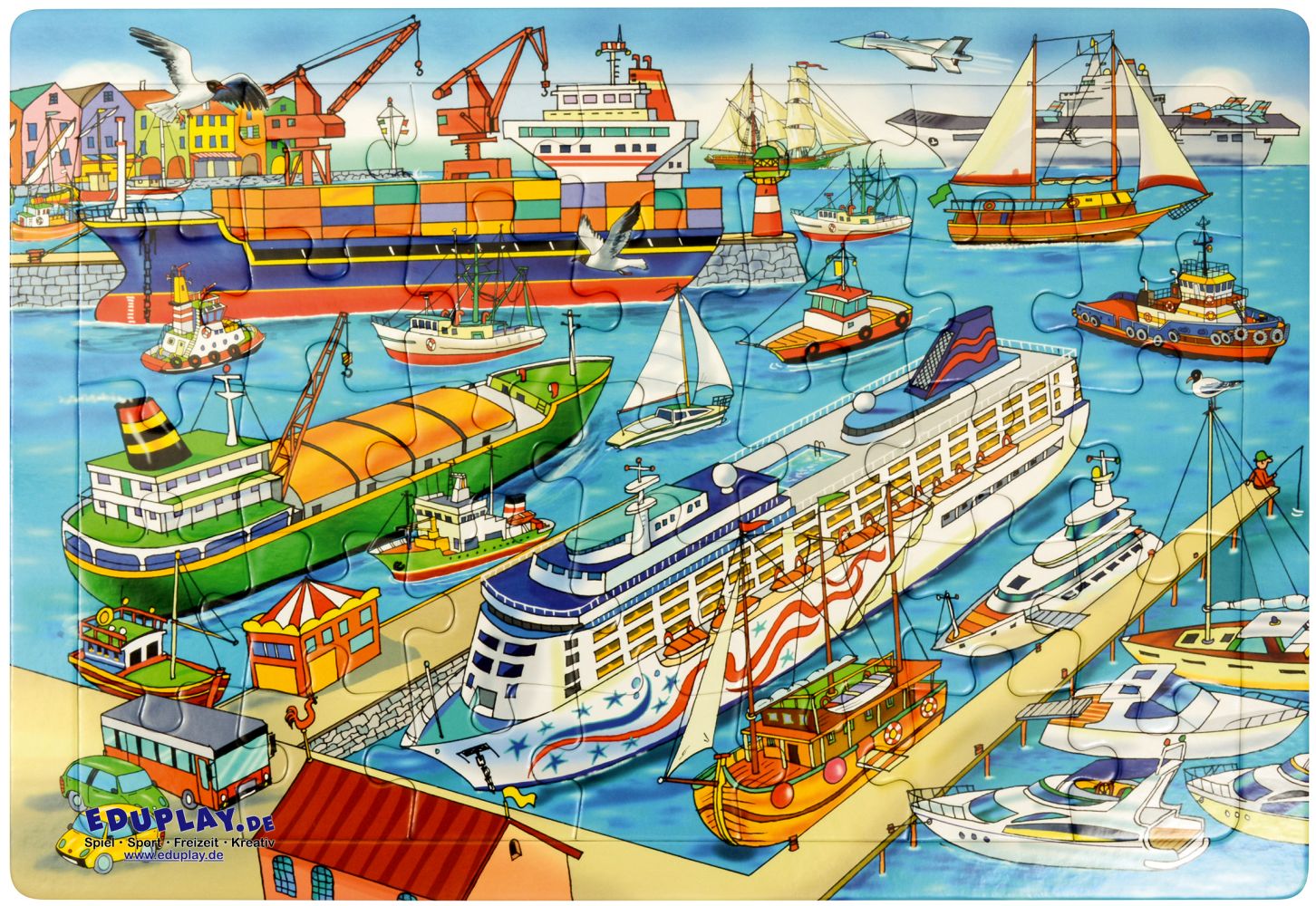 - Segelboote, Motoryachten, Fischerboote, ein Kreuzfahrtschiff und sogar ein Containerschiff - sie alle haben ihren Platz im Hafenbecken. 35-teiliges Puzzle.