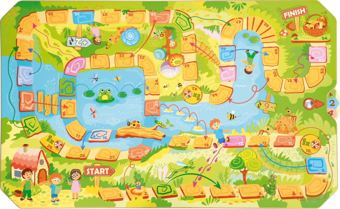 - Mit einer wunderschön illustrierten Landschaft steht der Tisch bereit zum 'Pilze sammeln' für bis zu 6 Kinder. Los geht es mit leeren Körben am Haus, durch den Garten und über den Fluss. Ein Drehrad mit Zahlen von 1 bis 6 an der kurzen Tischseite ersetzt den Spielwürfel. Je nach Zahl ergeben sich die Leiterspiel-typischen Abkürzungen und Umwege. Als Spielfiguren dient, was gerade parat ist.