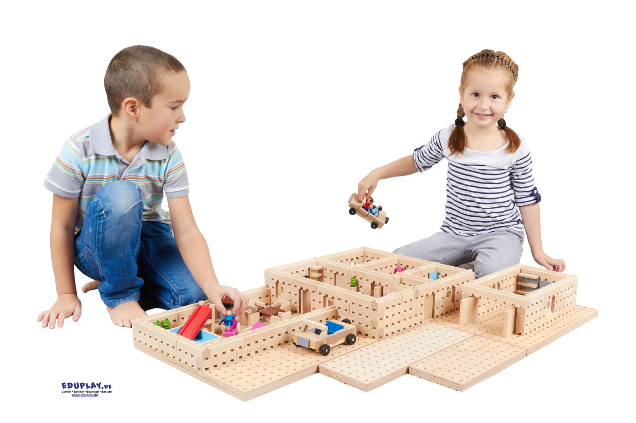 Der Traumhaus-Bausatz für kleine Architekten. Stein für Stein wächst der Grundriss des Holzhauses aus der Fundamentplatte empor. Die vertikalen Stäbe verbinden die Steine und geben den Mauern Halt. Hier und da sollte ein Fenster oder eine Türe eingeplant werden. Parallel dazu kann's ans Einrichten gehen: 42 Möbel und Ausstattungsgegenstände für Küche, Wohnzimmer, Schlafzimmer, Kinderzimmer und Bad können in den Räumen frei platziert werden ... und fürs Rollenspiel ziehen Mama, Papa, Junge und Mädchen ein. Inhalt: 1 Grundplatte, je 42 Bausteine in 2, 4, 6 und 8 cm Länge, 70 Befestigungsstifte, 8 Fenster, 5 Türen, 42 Teile Hausausstattung, 4 Personen.